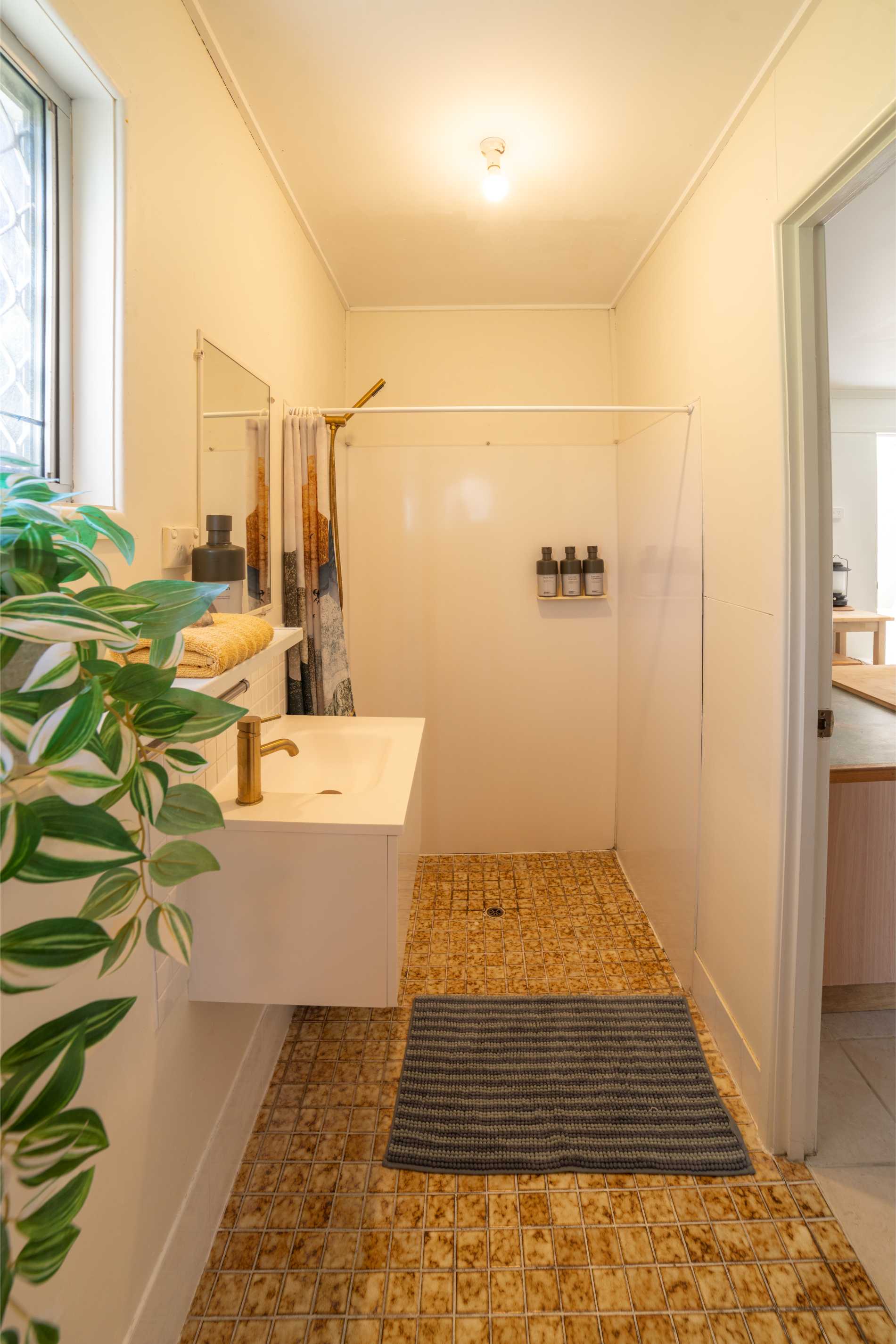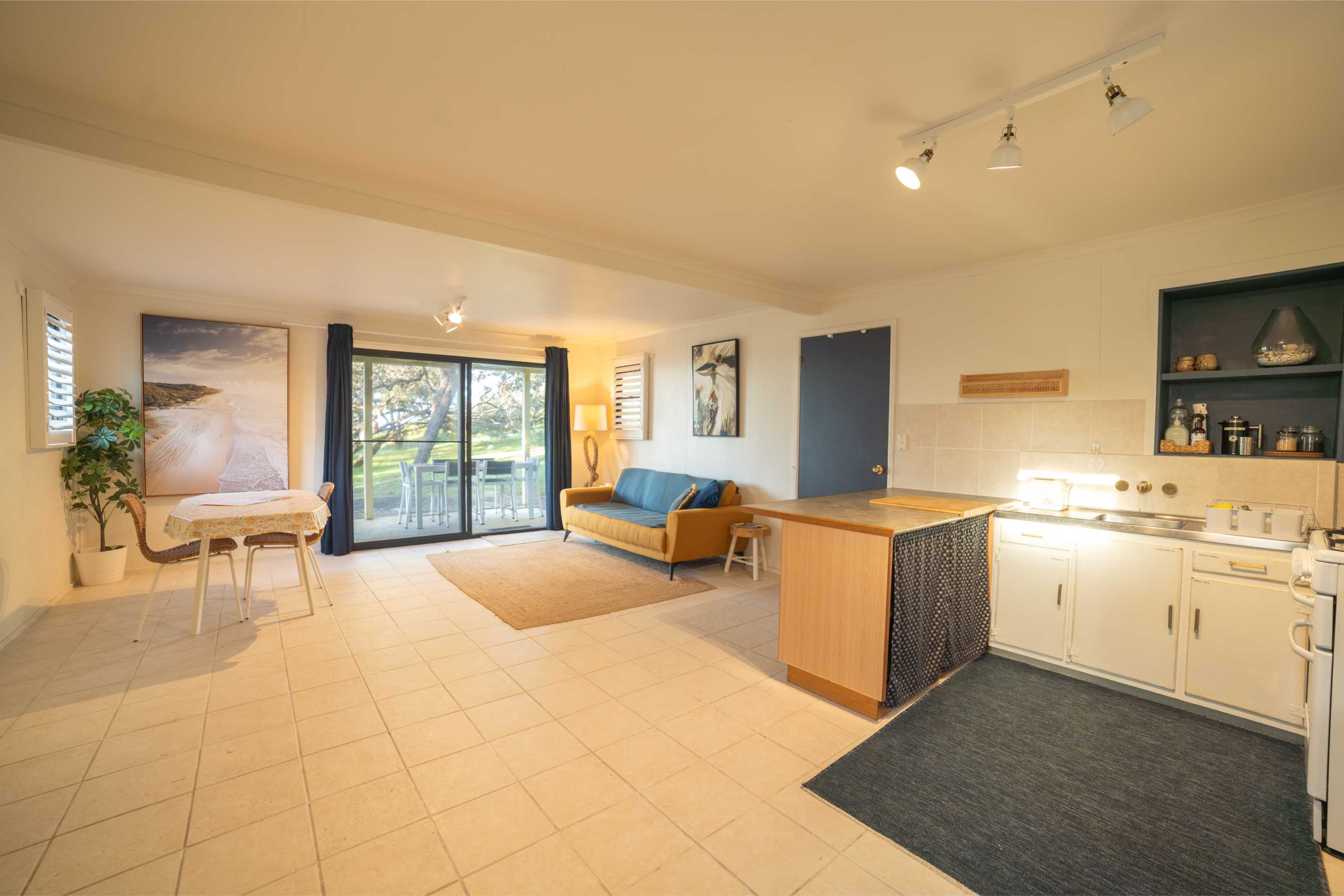 large bedroom features both a queen and single bed, making it ideal for a small group or family. With an open-plan living space that flows
